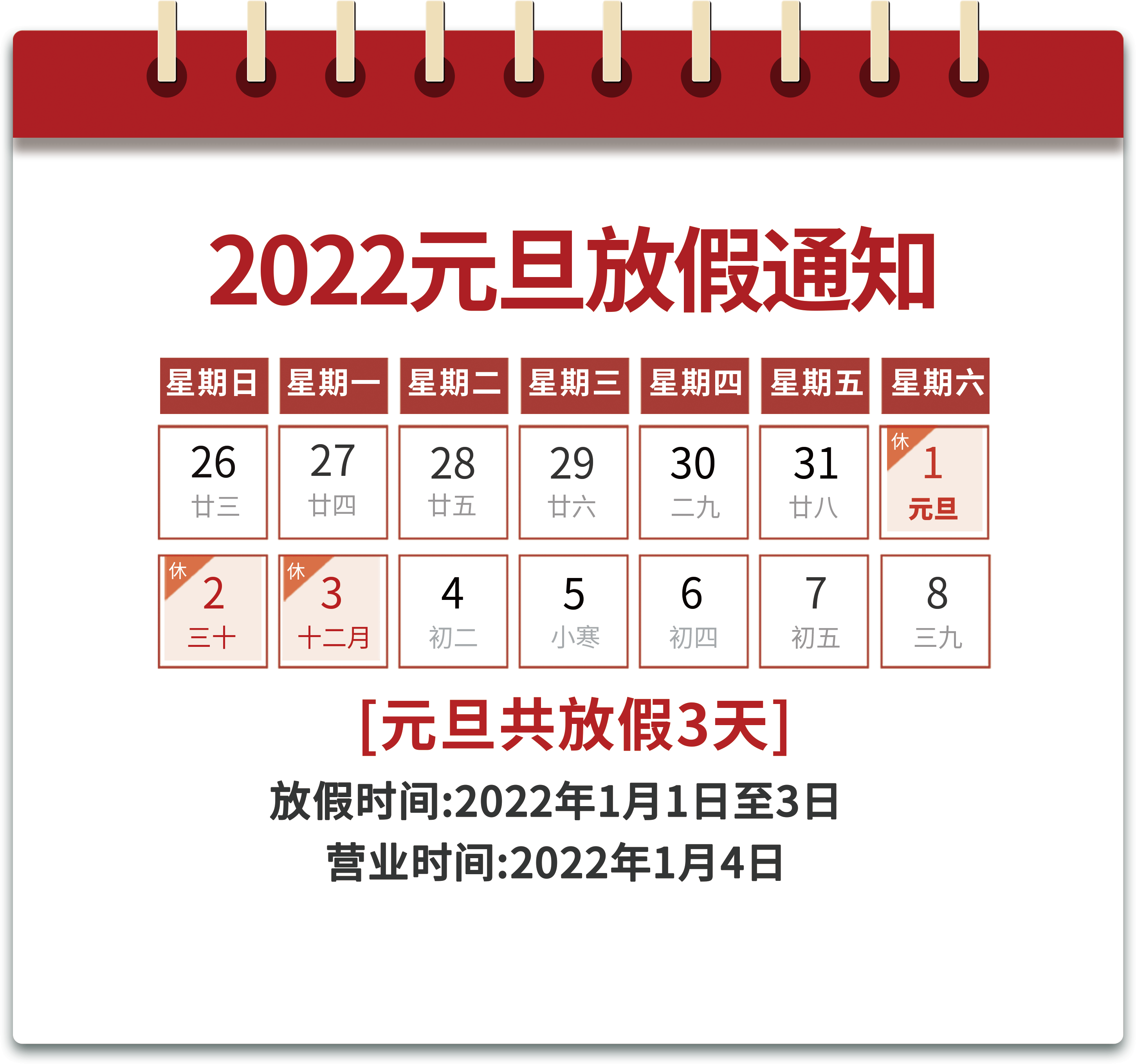 根據(jù)《國務院辦公廳關于2022年節(jié)假日安排的通知》,結合我司實際情況與工作安排,經(jīng)研究決定2022年元旦節(jié)放假安排如下:元旦2022年1月1日至2022年1月3日放假,共3天;1月4日(星期二)正常上班。