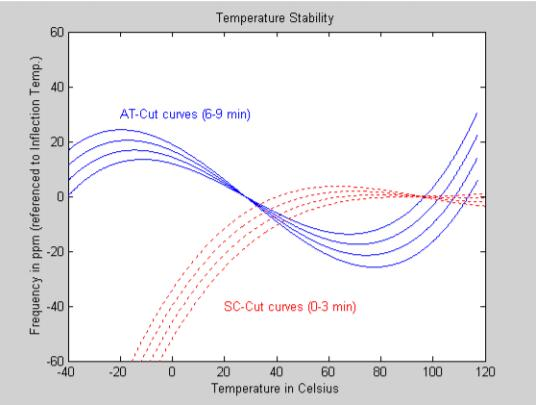 頻率與溫度穩(wěn)定性是描述晶體振蕩器的頻率輸出如何隨溫度變化的規(guī)范。FvT性能以十億分之幾或 PPB 來衡量。SC切割將改善振蕩器的性能。主要原因是晶體轉(zhuǎn)折點(diǎn)附近曲線的斜率。通常,SC切割的斜率是具有相同轉(zhuǎn)折點(diǎn)的 AT切割斜率的 1/3。SC切割提高 FvT性能的另一個(gè)領(lǐng)域是在井下應(yīng)用中看到的高溫范圍(-20℃至+200℃)下運(yùn)行。與AT的+27℃相比,拐點(diǎn)溫度約為+90℃,SC將在這些范圍內(nèi)實(shí)現(xiàn)更嚴(yán)格的穩(wěn)定性。在這個(gè)擴(kuò)展的溫度范圍內(nèi),改進(jìn)可能高達(dá)5倍。