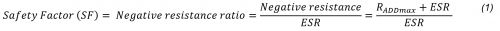 較小晶體的另一個(gè)特點(diǎn)是等效串聯(lián)電阻 (ESR) 更高。晶體的 ESR 取決于幾個(gè)參數(shù),例如頻率、晶體尺寸、電極尺寸和安裝結(jié)構(gòu)。但一般來(lái)說(shuō),晶體越小,ESR 就越高。在設(shè)計(jì)評(píng)估期間,需要考慮 ESR,以確??梢员WC穩(wěn)定的振蕩。穩(wěn)定振蕩的特征是安全系數(shù)為 5 或更大。安全系數(shù),通常也稱(chēng)為負(fù)電阻比,由負(fù)電阻與 ESR 的比率定義。安全系數(shù)的計(jì)算公式見(jiàn)公式(1)。