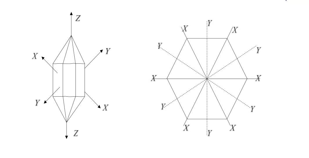 形狀是呈角錐形的六棱結(jié)晶體,具有各向異性的物理特性。按其自然形狀有三個(gè)對稱軸,電軸X,機(jī)械軸Y,光軸Z。