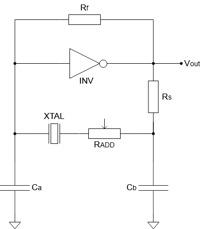 電路中的負電阻可以通過添加一個與晶體串聯(lián)的電位器來測量,如圖所示。電位器的電阻需要增加,直到晶體停止振蕩-這個電阻值標記為RADDmax。使用RADDmax和晶體的最大ESR可以計算出負電阻和安全系數(shù)。