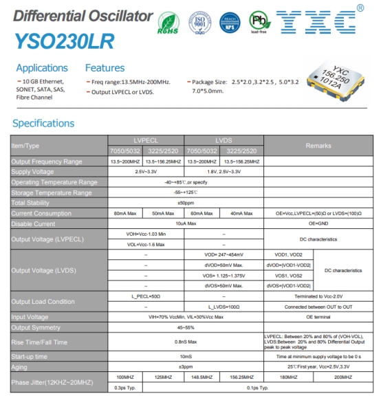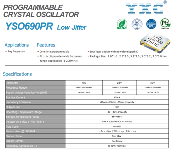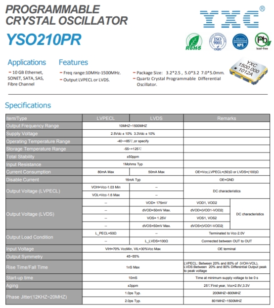 如果您對交付時間以及晶振更高頻段有要求,推薦使用揚興YSO210PR差分可編程晶振,10-1500MHz超高頻率范圍,有靈活的可編程性質(zhì),2秒快速出樣,生產(chǎn)交期2-3周。