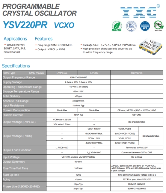 YSV220PR壓控可編程晶振廣泛使用在OTN、光模塊、集中基帶處理單元(BBU)、10GB以太網(wǎng)、高清數(shù)據(jù)采集設(shè)備等通訊類產(chǎn)品。
