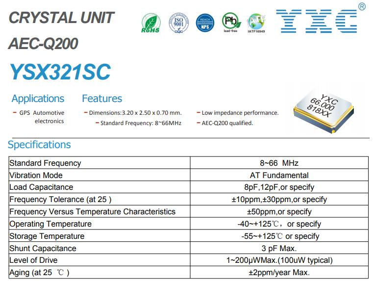 YSO140TC車規(guī)晶振,通過AEC-Q200/TS16949認證,工作溫度范圍為-40~+125℃,1-54Mhz頻率范圍,可兼容多個電壓(1.8-3.3V),超薄晶體,最小體積可做到1612,廣泛應用于GPS導航、汽車中控屏、車載攝像頭等。