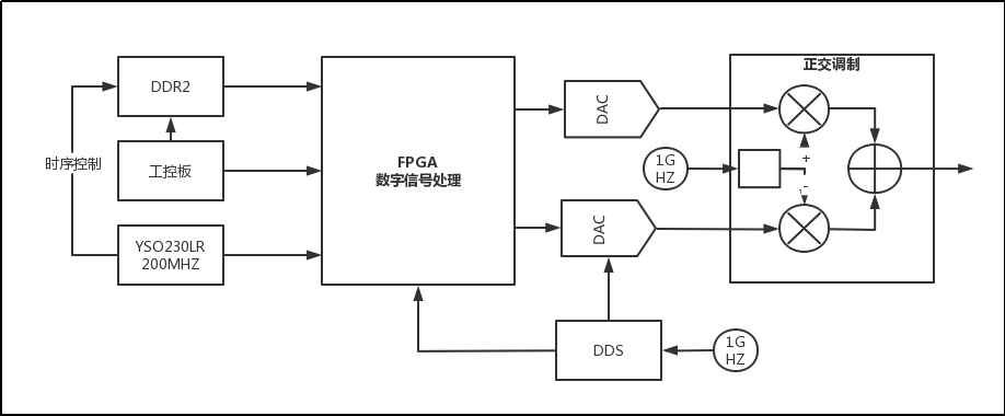 隨著FPGA器件的快速發(fā)展,其高速大容量可編程的特點使其得到廣泛應(yīng)用,對多模多制式的設(shè)計需求需要選用FPGA進(jìn)行設(shè)計,它主要完成數(shù)字信號處理工作。另外,由于TD-LTE、FDD-LTE的高數(shù)據(jù)量高速的要求,需要DDR2作為多模信號或用戶數(shù)據(jù)的存儲介質(zhì)。在基帶信號發(fā)生后,還需要將其DAC轉(zhuǎn)換后用寬帶正交調(diào)制器調(diào)制到各自載波上發(fā)射。另外,多模多制式信號的發(fā)生需要不同碼元速率的設(shè)計,需要選用DDS分頻出高分辨率可變時鐘。所以該設(shè)計選用“DDR2+FPGA+DAC+DDS+寬帶調(diào)制器”硬件架構(gòu)。