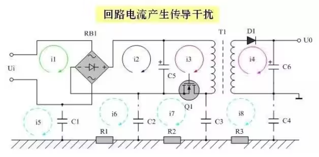 當電路存在數(shù)個回路電流,可將每個回路視為一個感應線圈,或變壓器線圈的初、次級。當某個回路中有電流流過時,另外一個回路中就會產(chǎn)生感應電動勢,從而產(chǎn)生干擾。最有效減少干擾的方法就是盡量減少每個回路的有效面積。