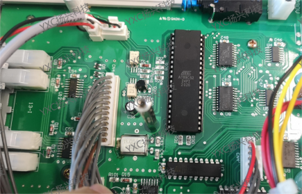 接下來仔細看看前PCB板的組成。大致可分為三部分:顯示電路,供電電源電路以及主控電路等。板子左下方有個金屬蓋,我們等會拆開研究一下。此時發(fā)現(xiàn)兩顆晶振,一顆HC-49UM封裝頻率為11.0592MHZ,另一顆被金屬外殼包裹著,通過小孔看到是一個10MHZ頻率源的晶振,推斷可能是功能型的晶體作為一個標準的10MHZ頻率源來使用。