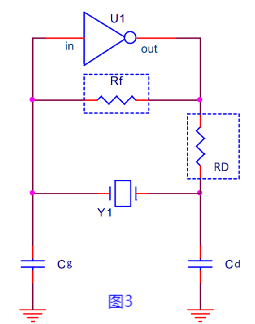 這個電阻的作用是限制IC的驅動能力,并且與Cd組成一個低通濾波器,以確保振蕩器的起振點在基頻上,而不是在其他高次諧波頻率點上(避免3次,5次,7次諧波頻率)。如果晶振的功耗超過晶振制造商的給定值,外部電阻Rd是必需的,用以避免晶振被過分驅動。如果晶振的功耗小于晶振制造商的給定值,就不推薦使用Rd,可以預設0?。如圖3所示