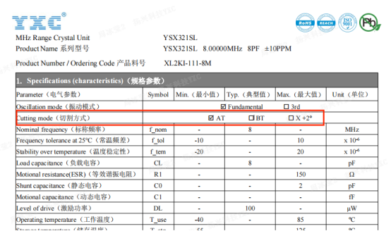 YXC晶振手冊中也會給出晶振的切割類型,以下舉例的是YSX321SL,切割方式就是AT切。