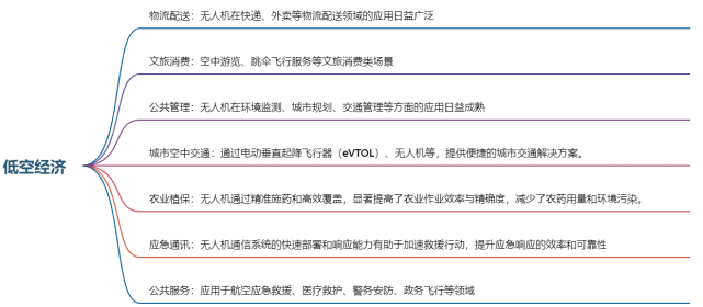 低空經(jīng)濟(jì)領(lǐng)域的主要產(chǎn)品包含無(wú)人機(jī)(消費(fèi)級(jí)、工業(yè)級(jí))、直升機(jī)、傳統(tǒng)固定翼飛機(jī)以及eVTOL(電動(dòng)垂直起降飛行器)等飛行器設(shè)備。包含的應(yīng)用場(chǎng)景豐富且多樣,包括但不限于: