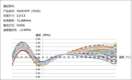 測(cè)試結(jié)果:在-30~85℃的工作溫度范圍內(nèi),測(cè)試樣品的溫度穩(wěn)定性滿(mǎn)足≤±2.5PPM