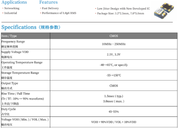 YSO511PJ為預(yù)編程TCXO。在-40~85℃的工作溫度范圍內(nèi),溫度穩(wěn)定性≤±2.5PPM、輸出方式為CMOS。該產(chǎn)品可滿(mǎn)足10~250MHz范圍內(nèi)任意頻率定制,適用于特殊頻率需求方案。