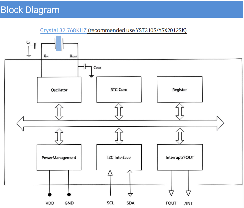 YSN8563由振蕩電路(Oscillator)、實(shí)時(shí)時(shí)鐘核心(RTC Core)、寄存器(Register)、電源管理(Power Management)、I2C接口(I2C Interface)以及中斷輸出電路(Interrupt/Fout)等構(gòu)成。YSN8563的實(shí)時(shí)時(shí)鐘核心主要負(fù)責(zé)提供精確的時(shí)間管理,其時(shí)鐘信號(hào)和頻率源由內(nèi)部振蕩電路與外部32.768kHz晶振共同提供。
