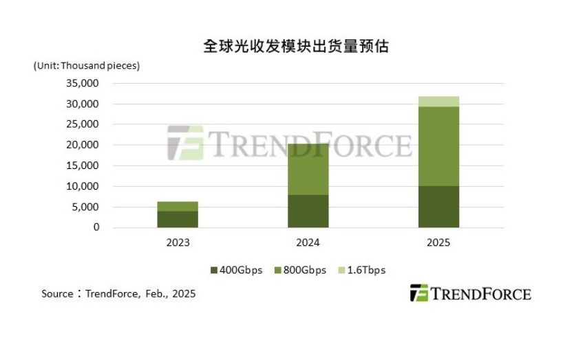 TrendForce指出,未來AI服務(wù)器之間的數(shù)據(jù)傳輸將依賴于大量的高速光收發(fā)模塊,這些模塊負(fù)責(zé)將電信號轉(zhuǎn)換為光信號進行傳輸,再將光信號轉(zhuǎn)換回電信號進行接收。據(jù)統(tǒng)計,2023年400Gbps以上的光收發(fā)模塊全球出貨量已達(dá)到640萬個,預(yù)計到2025年將超過3190萬個,年增長率高達(dá)56.5%。