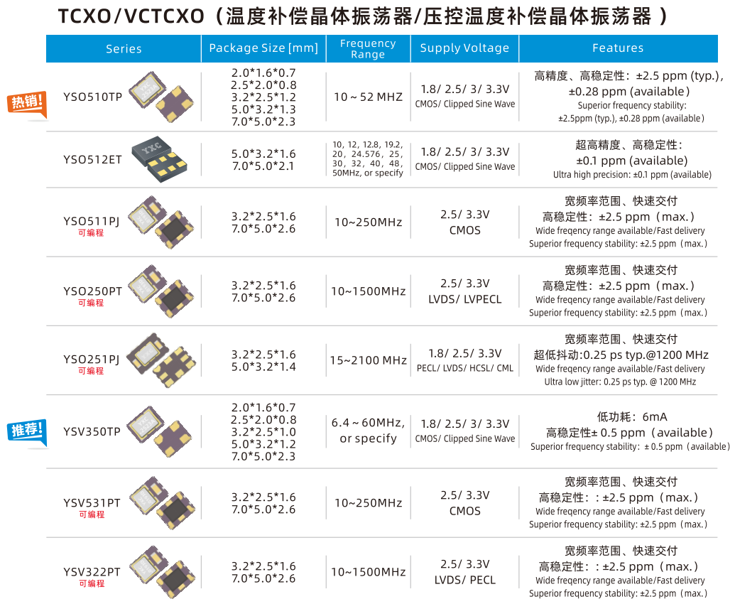 YXC提供超高頻率穩(wěn)定度、微型化、低相噪、低功耗、超高頻的TCXO產(chǎn)品組合。